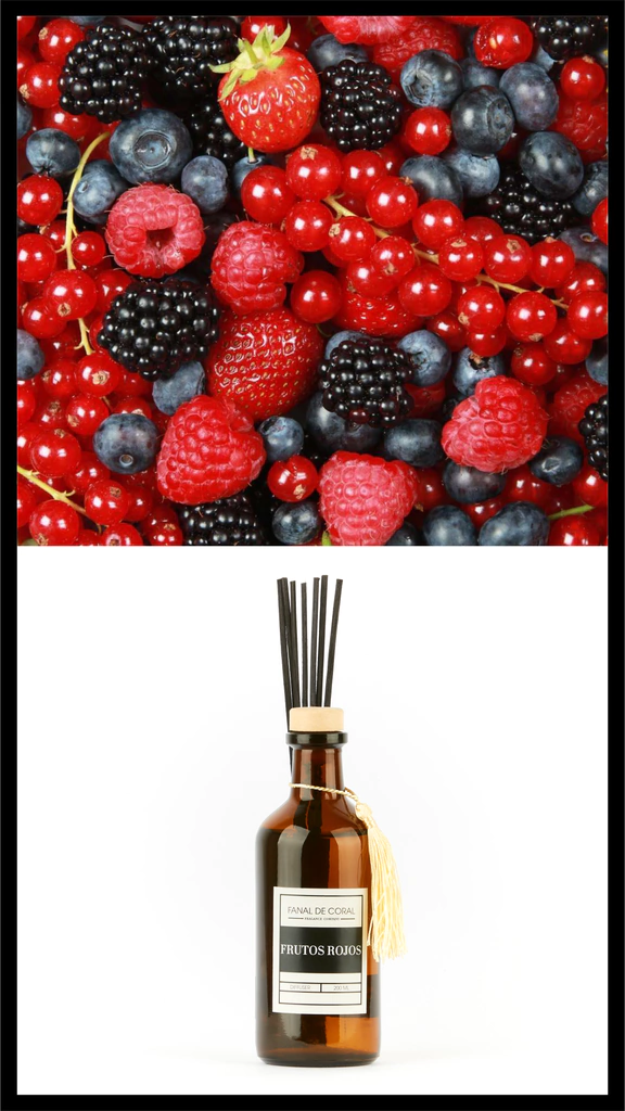 FRUTOS ROJOS es una fragancia dulce y envolvente en dónde mezclamos grosellas, pitangas, arándanos y frambuesas. Ésta fragancia aporta alegría y todo tipo de sensaciones positivas creando un ambiente agradable y confortable en nuestro hogar.